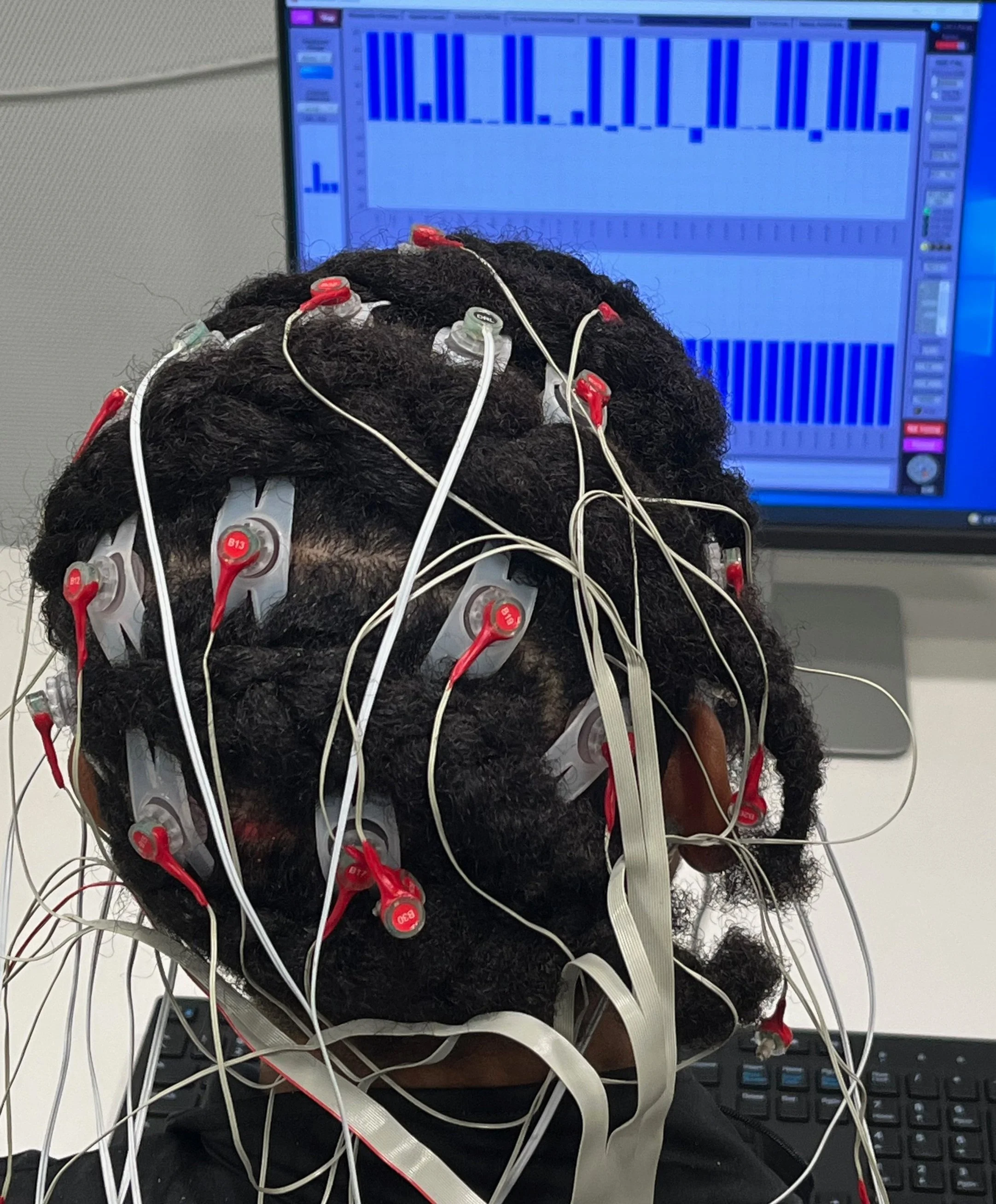 1. The hair is braided to expose the scalp — this alone improves the EEG signal quality (impedance) by 2x!